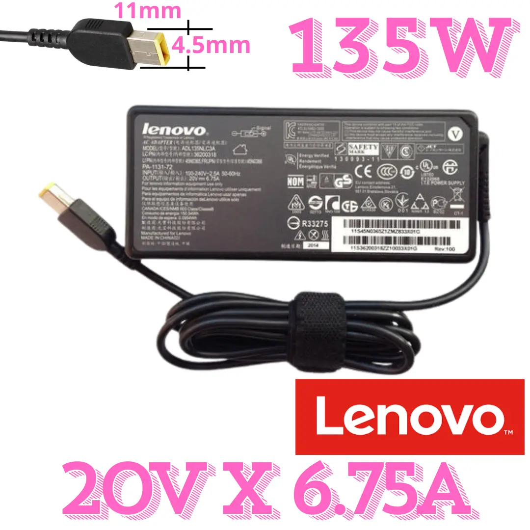🔌 detalle del productoCargador Original Lenovo 135W 20V 6.75A (Slim Tip Rectangular)Fuente de poder de alto rendimiento con conector rectangular amarillo (Slim Tip). Diseñado para laptops Lenovo potentes que requieren 135W, como las ThinkPad P Series, T Series, Yoga y más.💻 compatibilidades comunesCompatible conLenovo ThinkPad T440 / T450 / T540 / T560 / T570 / T580Lenovo ThinkPad W540 / W550s / W541 / P50 / P51 / P52 / P53 / P70 / P71Lenovo Yoga 15″, ThinkPad Yoga Series (con Slim Tip)Lenovo IdeaPad 700 series (con Slim Tip)Otros modelos que usen 20V 6.75A conector rectangular amarillo⚠️ No compatible con cargadores USB-C ni conector redondo (7.9mm o 4.0mm).